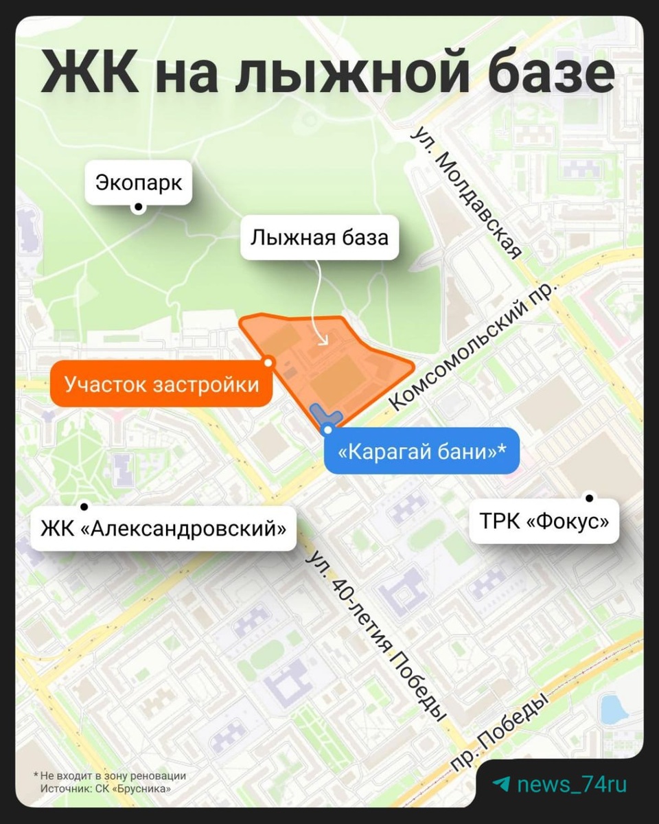 » Новые дома намерены возвести на углу Комсомольского проспекта и 40-летия Победы, где сейчас находится лыжная база, кафе, каток, а летом ставят открытый бассейн. У Комсомольского стоят три здания: в одном «Карагай бани», два других пустуют уже несколько лет. Всё в этой зоне (в том числе сама лыжная база) принадлежит ООО «Северо-Запад». В декабре учредителем организации стало ООО «Резерв З. Специализированный Застройщик», которая и принадлежит «Бруснике». 🟥Что там будет. Пока информации нет — мастер-план застройки представят в мэрию только в следующем году. 🗯 Ответ «Брусники». В компании заявили, что снесут только старую лыжную базу, а новые здания на Комсомольском сохранят. Одно из них реконструируют в спорткомплекс с игровым залом, мини-футболом и прокатом инвентаря. По соседству обещают построить здание для школы каратэ, которая сейчас занимает помещение лыжной базы. Каток, футбольные поля и площадку для городков застройщик также обещает сохранить и оставить доступными во вре
