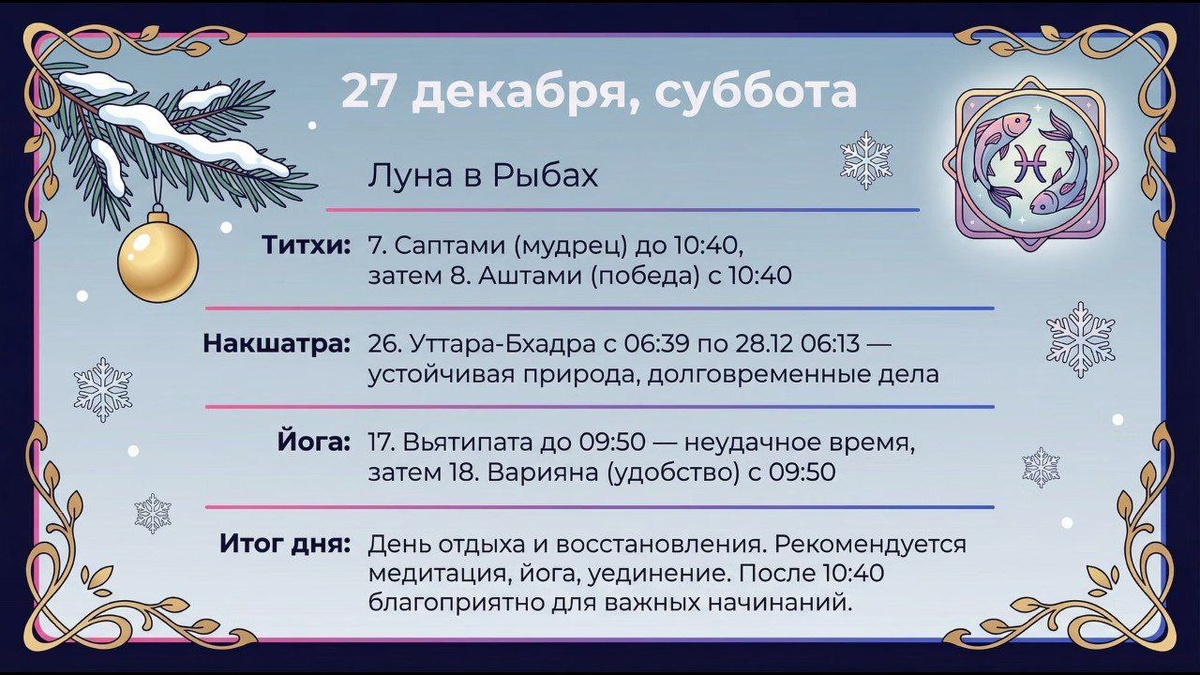 Корпоративный угар Вселенная сегодня настойчиво намекает: «Остановись, углубись в себя, помолчи». А наш с Рустамом календарь кричит: «Корпоратив!». Сегодня день Сатурна - время для медитации и очищения. Ну что ж, попробую медитировать под звуки скрипки и очищать душу в компании. Бросаю вызов транзитам! ⭐️космические показатели дня: 🔴 День недели: Суббота (Сатурн) - настроен на аскезу, но пойдем на фуршет. 🔴 Накшатра: Уттара Бхадрапада - мой взгляд будет устремлён не только в небо, но и на новогодний стол. 🔴Лунный день: Аштами (8-й день) - энергия для борьбы с внутренними демонами. Посмотрим, как получится. ⭐️Что фонит на моём небе: 1️⃣. Вселенная говорит «отдыхай», я иду праздновать. День идеален для молитвы и заботы о старших. Пожалуй, проявлю заботу… о соседях по столу. 2️⃣. Накшатра велит смотреть вверх. Уттара Бхадрапада - антенна к божественному. Буду искать связь с высшим, любуясь узорами на потолке банкетного зала или красивым пассажем скрипки. Это мой духовный лайфхак н