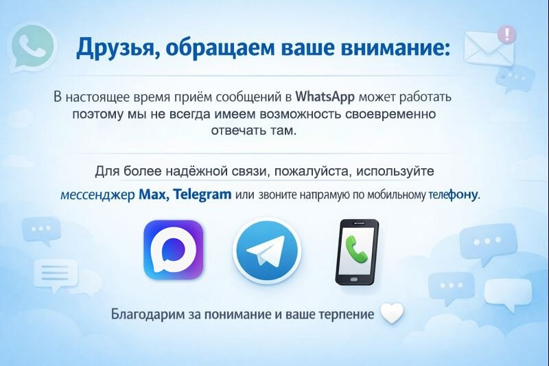 возможность своевременно отвечать там. Для более надёжной связи, пожалуйста, используйте мессенджер Max, Telegram или обращайтесь напрямую по мобильному телефону. Благодарим за понимание 🤍