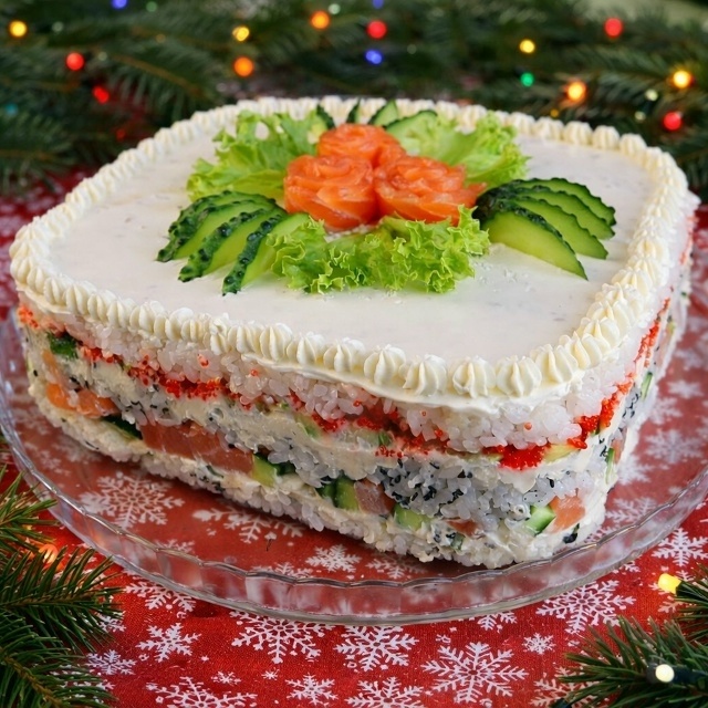 15. Снять форму. Верх покрыть сливочным сыром, украсить розочками из рыбы, огурцом и листьями салата.