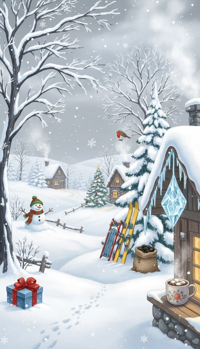 Поработаем с вниманием? Найдите: – Снеговик с шарфом. – Санки. – Лыжи. – Елка с игрушками. – Подарок, завернутый в бумагу. – Птица (например, синица), сидящая на ветке. – Кристалл льда. – Мешок с углем для печки. – Чашка горячего шоколада. – Следы животных на снегу.
