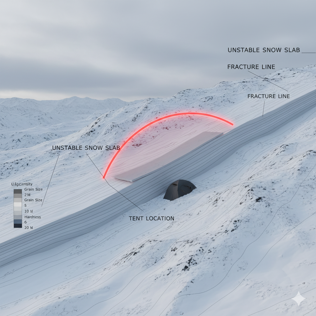 Input (Вводные данные): Рельеф: Не просто «средний уклон», а лазерное сканирование местности. ИИ нашел скрытые «ступени» — локальные перегибы высотой 4-6 метров, где угол резко скачет до критических 30°. Снег: Многослойный «пирог». Снизу — ледяная корка (слабый горизонт), сверху — плотный ветровой наст. Триггер: П