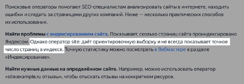Оператор «site» показывает лишь часть страниц в Яндексе Некоторые SEO-специалисты до сих пор сохраняют уверенность в том, что поисковый оператор «site» показывает все страницы сайта находящиеся в индексе Яндекса. Это уже давно не так, сегодня количество страниц в индексе можно узнать только через Яндекс Вебмастер. Например, используя поисковый запрос site:balticdigitaldays.ru у меня не выводилась страница https://balticdigitaldays.ru/rec2025, но при использовании другого запроса url:https://balticdigitaldays.ru/rec2025 она прекрасно находится. Зачем этот «site» тогда сегодня нужен? Чтобы ограничить коллекцию документов в поиске только определенным сайтом (например, продвигаемым вами) и посмотреть несколько примеров документов с сайта. Также его можно использовать чтобы найти на сайте: 1. Релевантные документы site:balticdigitaldays.ru telegram 2. Документы нужной даты индексации site:balticdigitaldays.ru date:20250101..20251231 3. Документы интересующего типа site:optimization.ru mi