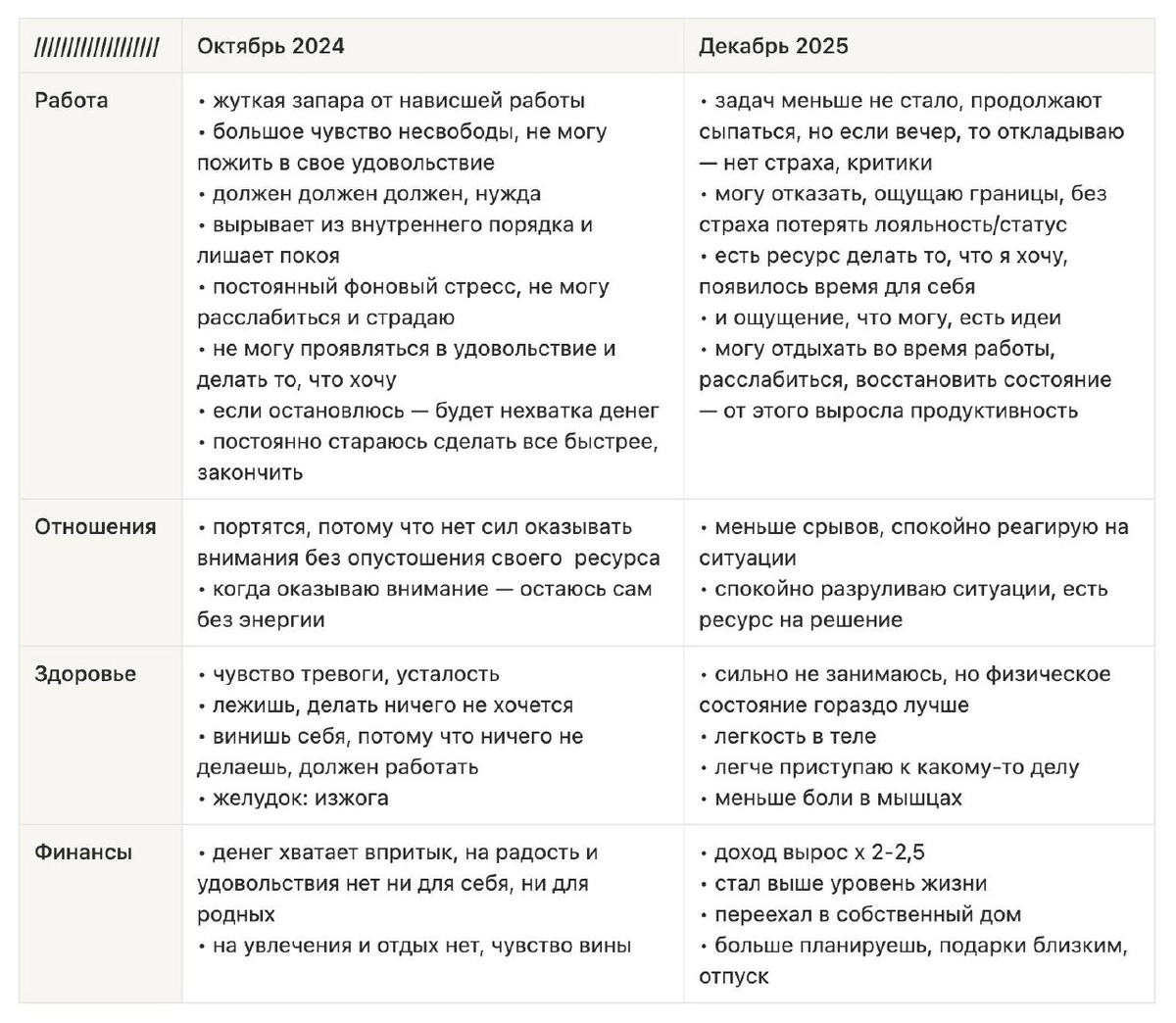 А вот, кстати, промежуточные итоги нашей регулярной работы, которая длилась в течение года (мы продолжаем взаимодействие) с человеком, про которого говорю в записи. Запрос на проработку проявленности в жизни.