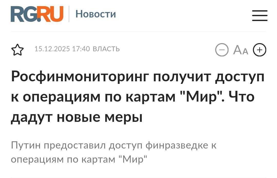 ⚡️ Власти получили мгновенный доступ ко всем переводам Путин подписал закон, открывающий Росфинмониторингу любые операции по картам «Мир» и через СБП Ведомству больше не нужны долгие запросы в банки — все транзакции видны сразу Новые правила тотального контроля заработают с 1 сентября 2026 года // Похоже, пора возвращаться к наличке @MediaComputers