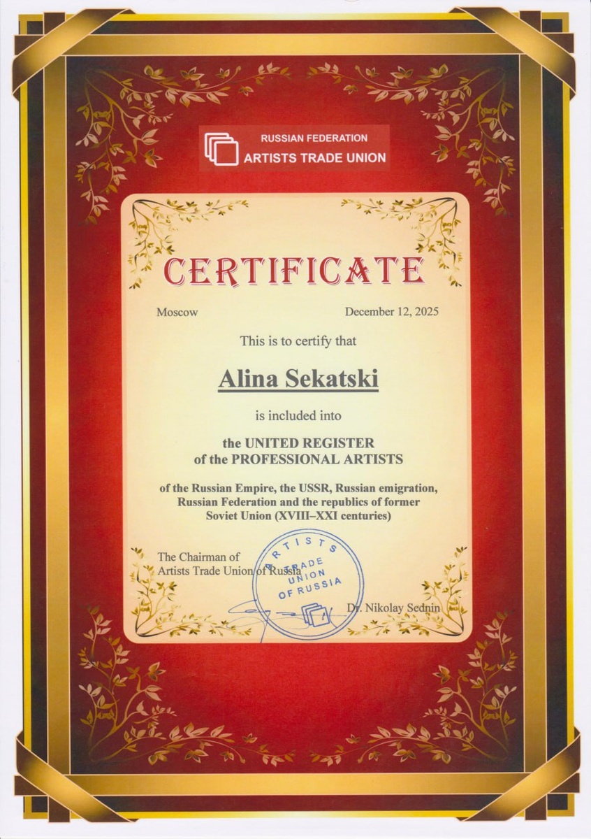 В первый день зимы я прошла отбор приёмной комиссией ПСХР, которая оценила мои достижения и работы, присланные в заявлении на вступление. В нём я указала: — свою творческую биографию, образование; — фото работ за несколько лет; — список выставок и конкурсов, в которых участвовала, сертификаты об участии (Россия, США, Швейцария, Англия, Франция); — список побед в международных конкурсах, сертификаты о победах, ссылки на сайты с информацией о победе (Швейцария, США); — информацию о том, что мои работы находятся в частных коллекциях России, США, Германии, Норвегии; — заключение эксперта по культурным ценностям Министерства Культуры РФ, подтвердившее статус моей работы как культурной ценности; — свидетельство о регистрации личного бренда. На основании этого комиссия присвоила мне рейтинг 6-В (профессиональный востребованный художник), выдала членский билет, официально подтвердив мой статус профессионального художника и признание таковым. Меня также внесли в Единый Реестр Профессиональных