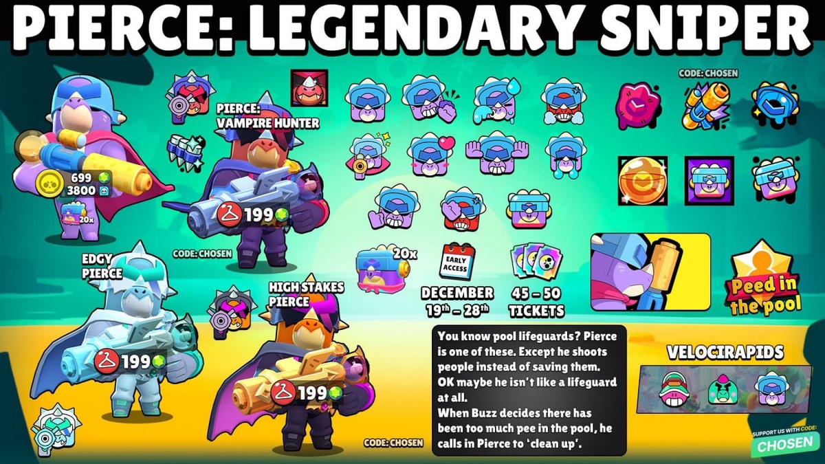 😄 Все о новой легендарке Новый легендарный персонаж Пирс выйдет уже 19 декабря с событием раннего доступа. Чтобы получить персонажа, нужно открыть целых 20 ящиков, при этом выдадут 45-50 билетов. А его титул — «Писаю в бассейн». ✅Новости по Clash Royale - ТЫК 😌Новости по Roblox - ТЫК Мир Supercell. Подписаться
