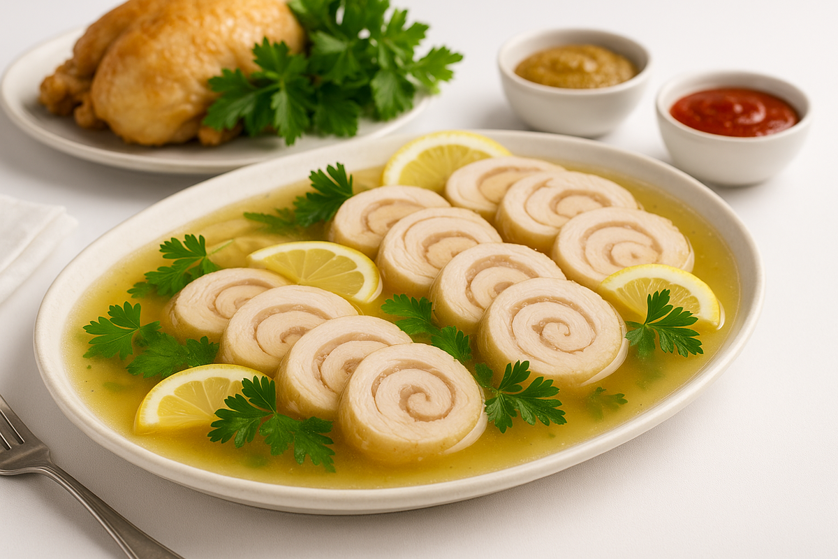 Это тот самый случай, когда блюдо выглядит сложнее, чем есть на самом деле. Тонко нарезанные куриные рулетики, прозрачный бульон, зелень, аккуратные цветные вкрапления в срезе. На праздничном столе такое заливное всегда принимают за работу профессионального повара, хотя готовится оно спокойно и без спешки.