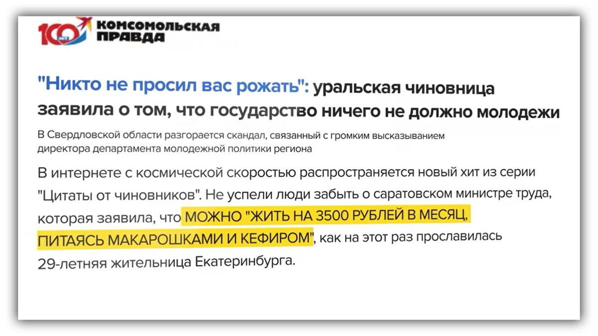 Многие люди задают такой вопрос: зачем наши власти злят народ, принимая грабительские, идиотские законы, вводя различные ограничения и делая подобные заявления -> можно "жить на 3500 рублей в месяц, питаясь макарошками и кефиром" [Директор департамента молодёжной политики Свердловской области]?