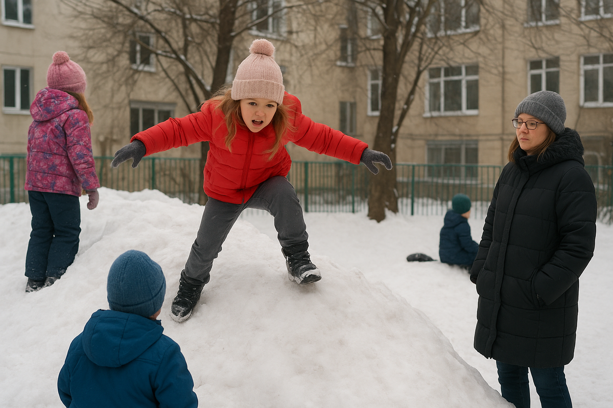Дальше стало хуже. Лиза предложила играть в догонялки прямо на горе. Для малышей, которые и так на снегу через шаг спотыкаются, это было опасно. Мы пытались вмешаться, но дети уже разошлись, не слушали взрослых. Лиза начала толкаться — и вскоре одна девочка упала, неловко скатилась на бок и расплакалась. Мама забрала её, и они ушли.