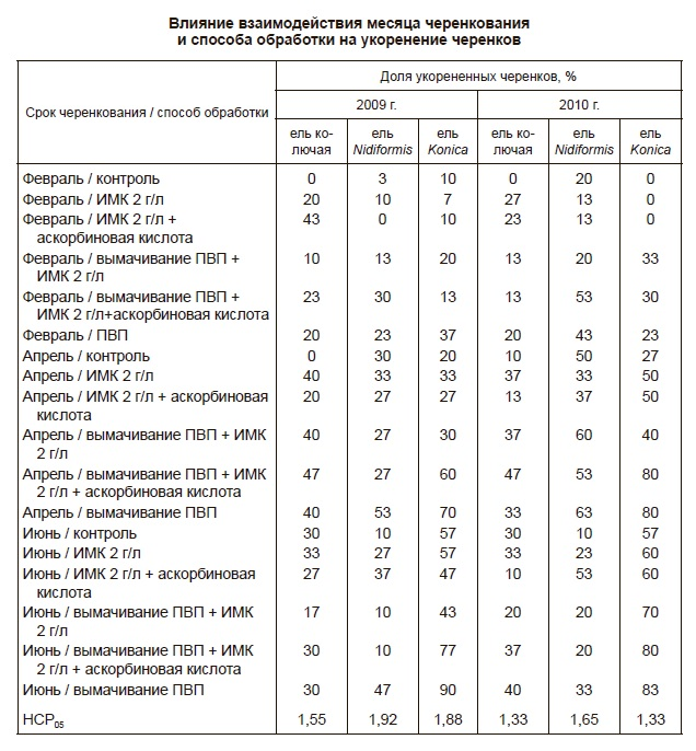 В отличие от предыдущих вариантов укоренение ели сизой Konica наиболее отзывчиво на месяц черенкования — 61% в 2009 и 72% в 2010 г. (таблица).
