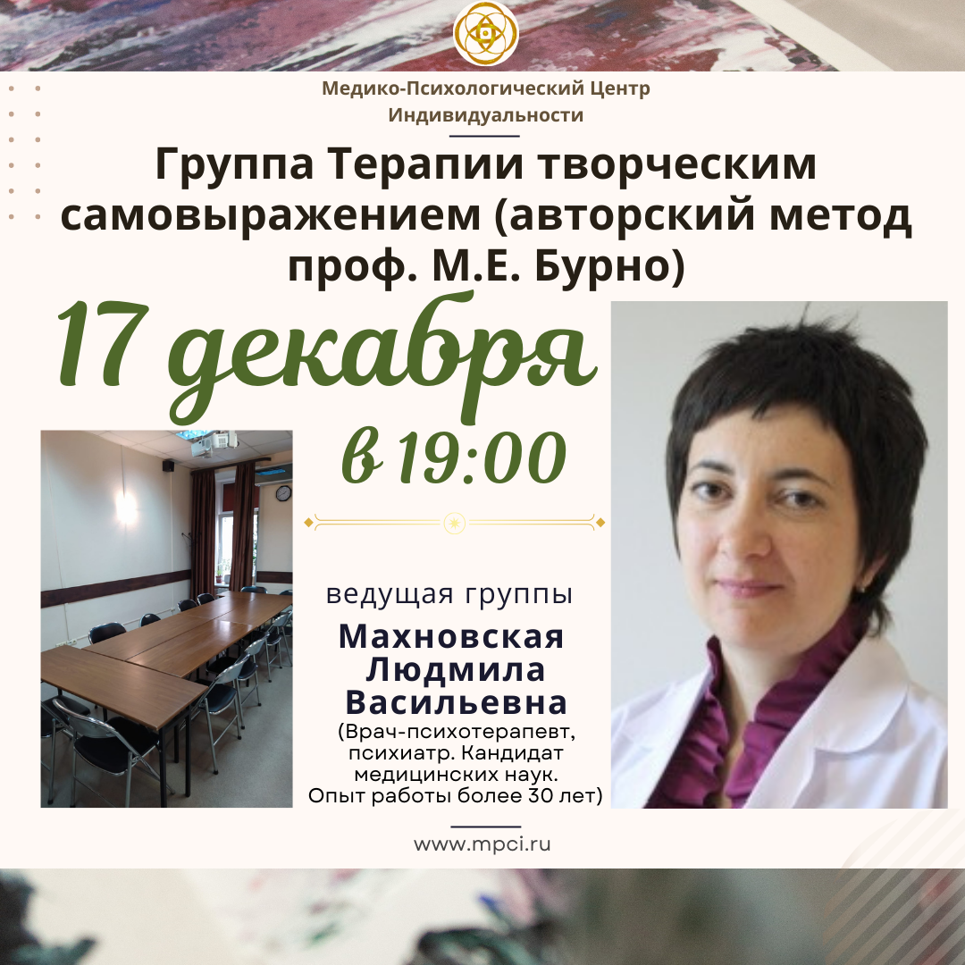 📆 17 декабря в 19:00 состоится очередное занятие группы «Терапия творческим самовыражением» с ведущей Махновской Людмилой Васильевной (Врачом-психотерапевтом, психиатром) 📚 На занятии будет проходить чтение психотерапевтического рассказа Марка Бурно "Кража" о детском проступке, который запомнился на всю жизнь. 👉🏻 Затронется тема воспоминаний детства. ❣️ Почему они так дороги каждому из нас? Перед занятием рекомендуется вспомнить несколько событий из детства, радостных или грустных, которые вы считаете ценными для себя. Можно сделать короткую запись о них.📝 ☝🏻 Группа долгосрочная, открытого типа, т.е. в ней можно заниматься длительно и новые участники могут вливаться в группу на любом этапе ее работы! ❤️ С нетерпением будем ждать всех желающих в нашем Центре! ✍🏻 Для, участия в занятии необходимо записаться у администратора ⬇️ https://wa.me/79160447020