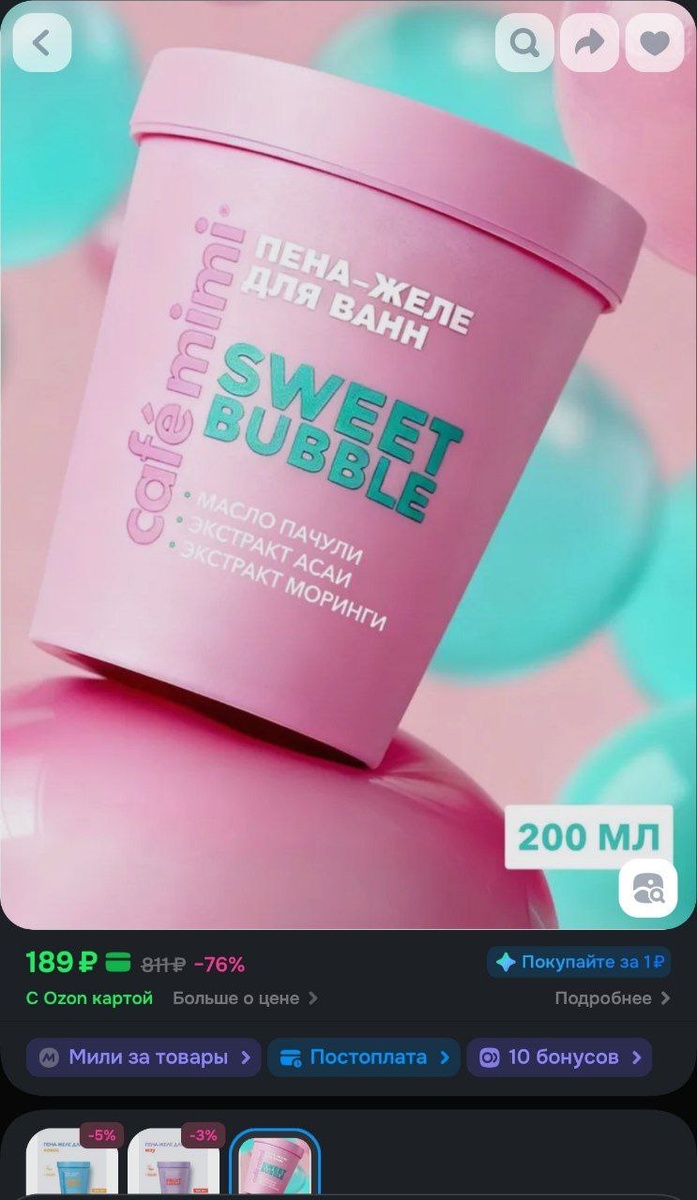 Cafe Mimi / Пена-желе для ванн SWEET BUBBLE, 200 мл ➕ 150 бонусов в карточке товара около названия магазина (ими можно оплатить 25% от суммы) https://ozon.ru/t/RlzVCT7