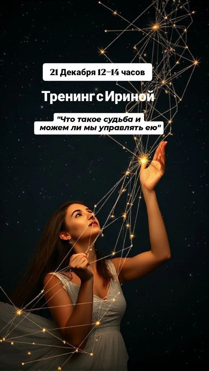 ✨ 21 декабря | 12:00–14:00 ✨ Тренинг с Ириной «Что такое судьба и можем ли мы управлять ею?» 🌈 Судьба — это приговор или сценарий, который можно переписать? Можно ли понять, что вы идёте своим путём — и что делать, если чувствуете, что сбились с курса? 🔹 Новый формат живого тренинга 🔹 Продолжительность — 2 часа 🔹 Практика + разбор реальных ситуаций 🚩 На тренинге вы узнаете: что такое судьба и из чего она складывается можем ли мы влиять на её ход и как именно как распознать сигналы, что путь выбран неверно когда и зачем нужна корректировка жизненного направления На примере нескольких участников Ирина подробно разберёт тему трансформации судьбы и покажет, какие изменения возможны уже сейчас. 🤗 💫 После тренинга вы сможете задать Ирине личные вопросы и получить индивидуальные ответы (дополнительно оплачивается). 💰 Стоимость участия: 2000 ₽ 📍 Количество мест не ограничено 📩 Запись и подробности — в личные сообщения и по тел. 📱 +7(905) 623-30-47