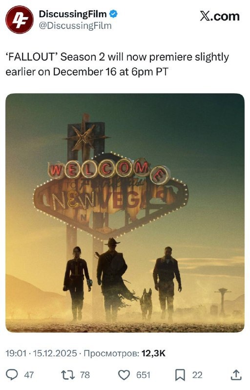 ⚡️ Второй сезон «Фоллаута» выйдет раньше срока — в «бесплатных кинотеатрах» продолжение появится уже 16 декабря, на день раньше плана.