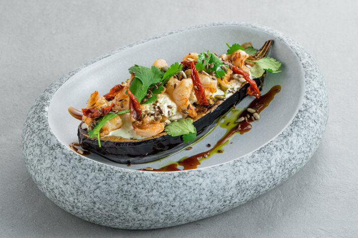 Баклажан выкладываем на тарелки, сверху крем, затем креветки, украшаем зеленью, можно посыпать семенами кунжута сверху по желанию.