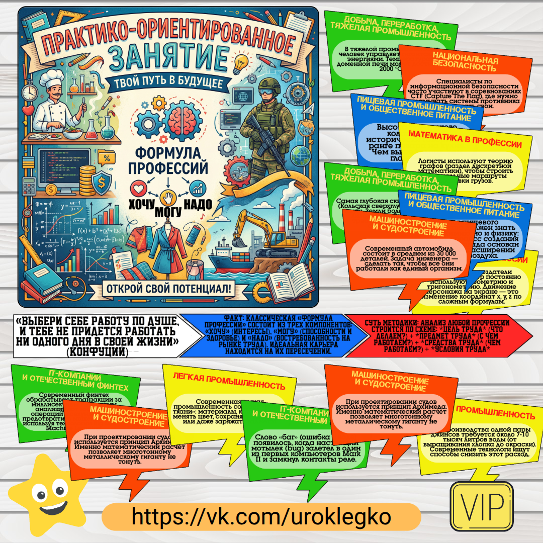 Данное оформление создано для того, чтобы визуально структурировать и сделать максимально наглядным и интерактивным практико-ориентированное занятие «Россия — мои горизонты». Оно помогает педагогу организовать пространство класса, привлечь внимание школьников и вовлечь их в активное обсуждение, превратив теоретический разбор «Формулы профессии» в живой диалог. Крупный плакат служит центральным смысловым ядром, задающим тему, речевые облачка с афоризмами и фактами по отраслям экономики — это готовый материал для групповой работы и мозгового штурма, а стрелки с пояснениями — ключ к пониманию методики, позволяющий ученикам самостоятельно разобраться в основах профориентационного анализа. Где можно скачать: https://vk.com/uroklegko