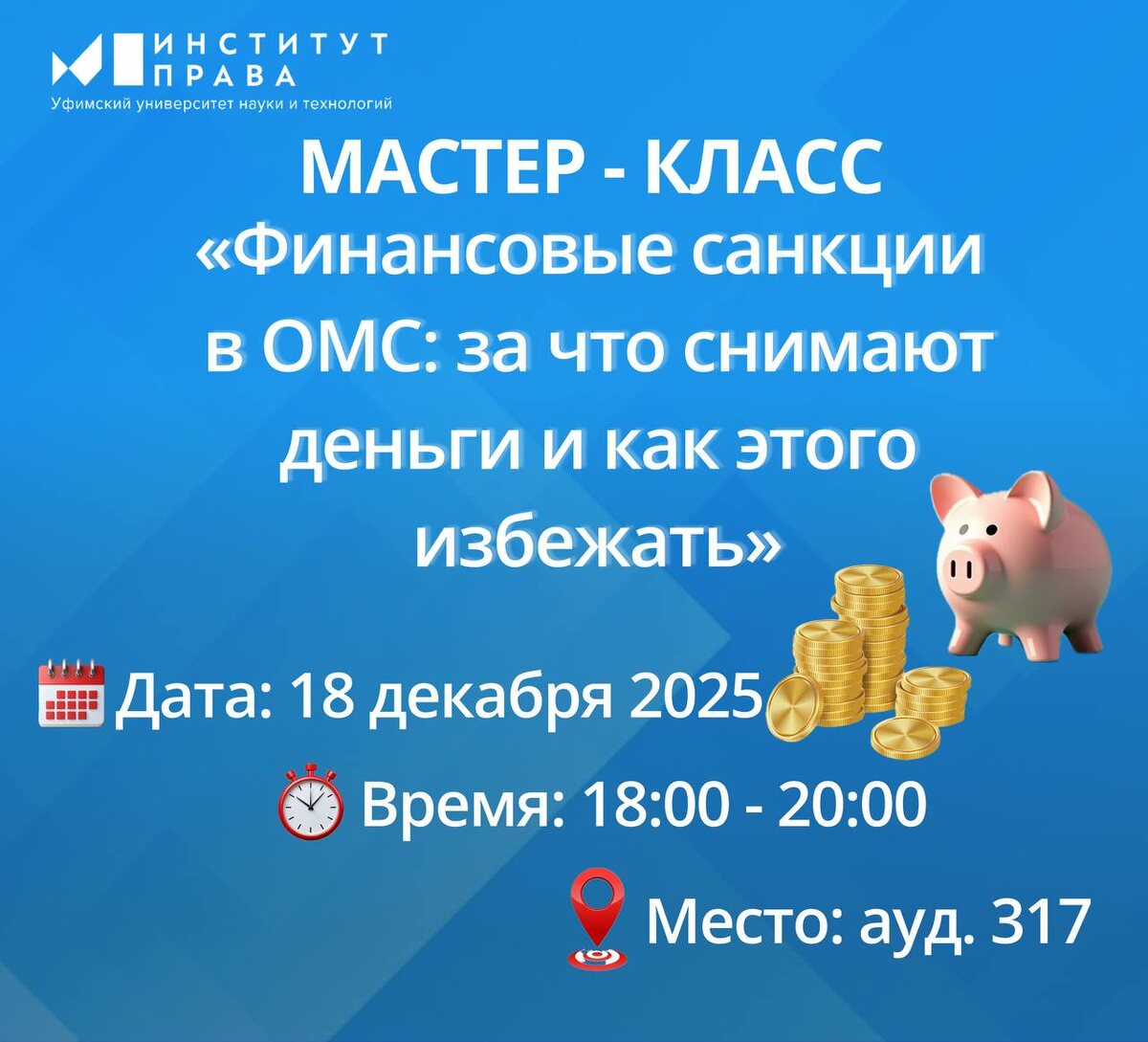 ➡️ Дорогие студенты! 📩Приглашаем вас на мастер-класс «Финансовые санкции в системе ОМС: основания, порядок применения и способы защиты». 🔨Ведущий: Сагидуллин Рафаэль Хамитович, к.м.н., доцент кафедры криминалистики, эксперт в области медицинского права. ⤴️В программе: · Основания для применения финансовых санкций в ОМС. · Процедура наложения и обжалования · Практические аспекты предотвращения санкций и защиты прав. Дата: 18 декабря ⏰ Время: 18:00 ✨ Место: ауд. 317 🏛️ Регистрация обязательна: https://forms.yandex.ru/u/693d181c84227c1d5c29dcab