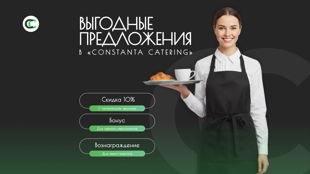 Каждое событие должно быть не только ярким и запоминающимся, но и выгодным. В «Constanta Catering» мы уверены, что идеальное мероприятие не должно быть обременительным для вашего бюджета. Поэтому мы подготовили для вас несколько выгодных предложений, которые помогут сделать ваш праздник не только вкусным, но и финансово выгодным! Наша команда всегда готова сделать ваши торжества особенными, и мы рады предложить вам скидку 10% на меню для вашего мероприятия. Всё, что нужно сделать — это использовать промокод «вкусно» при заказе. С этим кодом вы получаете скидку на вкуснейшее меню, которое идеально подходит для любого события — от корпоративов до свадеб. Представьте: заказываете у нас праздничный банкет и получаете высококачественные блюда с приятной скидкой. Не упустите шанс сделать праздник еще более вкусным! Вы только планируете провести своё первое мероприятие с «Constanta Catering»? Мы подготовили для вас особое предложение! Закажите первое событие с нами — и получите эксклюзивный б