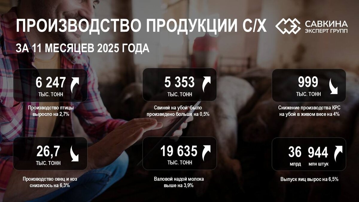 Согласно данным бюллетеня Федеральной Службы Государственной статистики (Росстат) по сельскохозяйственным организациям Российской Федерации (без учета статистической информации по Донецкой Народной Республике, Луганской Народной Республике, Запорожской и Херсонской областям), производство скота и птицы на убой в живом весе за январь-ноябрь 2025 года выросло на 1,2% и составило 12 млн 642 тыс. тонн: Производство птицы составило 6 млн 247 тыс. тонн в живом весе, увеличившись за год на 2,7%. Сельскохозяйственными организациями производится более 95% мяса птицы в России. Свиней на убой в живом весе было произведено на 0,5% больше до 5 млн 353 тыс. тонн. Отметим, что на сельскохозяйственные организации в России приходится 95% выпуска свинины, при чем ТОП-20 производят почти 80%; Производство КРС на убой в живом весе снизилось в годовом выражении на 4% до 999 тыс. тонн. Напомним, что в сельхозорганизациях производится лишь 48% говядины, еще около 40% выпускается хозяйствами населения и 12% п