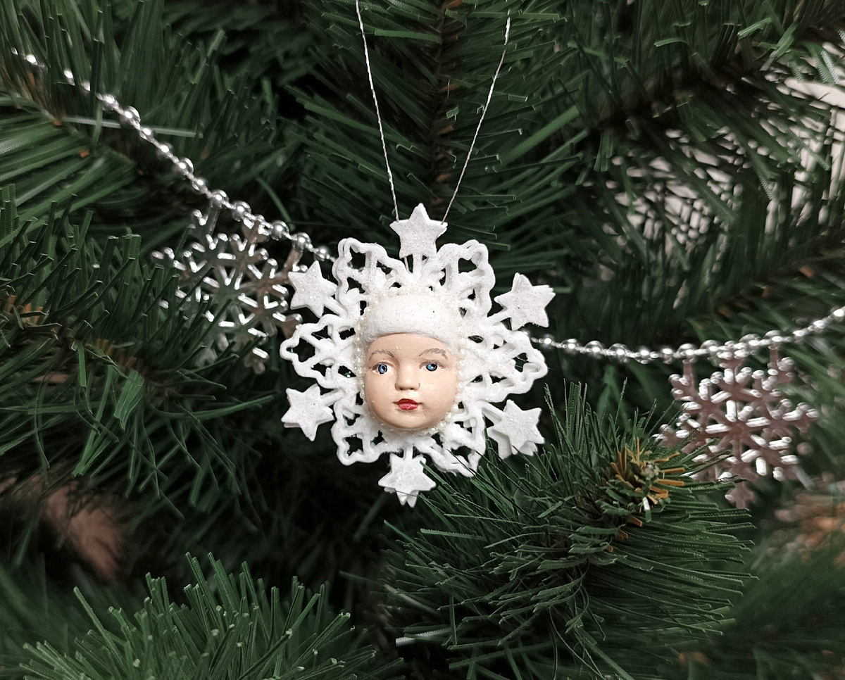 Сегодняшнему мастер-классу предшествовала статья с краткой историей объяснения этого необычного образа - личика в обрамлении снежных лучей: А теперь хочу показать свой вариант воссоздания старинной подвески. Родилась идея не случайно. В моей коллекции елочных игрушек были ретро-снежинки с личиками из прессованных опилок и в обрамлении лучей из картона. Возраст таких игрушек - примерно 30-50 годы 20 века. К сожалению, до меня ижи снежинки дошли в плачевном состоянии - от одной осталось только лицо, у другой сохранилось несколько лепестков: Сначала была мысль подправить имеющиеся личики и наклеить их на новую основу. Но потом я поняла, что диссонанс между винтажным личиком и свежим обрамлением будет точно. Образ растеряет свое очарование и аутентичность. Поэтому я принялась за изготовление снежинки-личика с нуля. В первую очередь отлила из гипса подходящую детскую мордашку, высушила и расписала акриловыми красками: Если вы умеете вырезать из бумаги изящные ажурные снежинки, то могу толь
