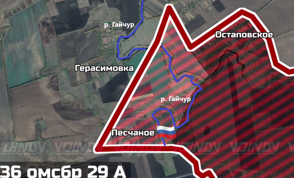 Приятно, знаете ли, иногда увидеть, что оказался прав в своих предположениях. Докладываю. Сегодня Министерство обороны РФ доложило, что наши войска освободили населенный пункт Песчаное Днепропетровской области. 25.11.2025 я писал, что Песчаное, скорее всего, будет одним из первых сел, освобожденных на западном берегу реки Гайчур: Впрочем, несложно объяснить такую мою прозорливость. Именно на этом участке наши части группировки "Восток" ранее всего вышли к водной преграде и начали утюжить всем, чем можно противоположный берег, где командование ВСУ обустроило мощную оборонительную линию. К тому же, если верить картам, река Гайчур тут значительно ужЕ, чем выше по течению, как странно бы это не казалось. Вот такую карту рисует телеграм-канал "Воин DV". Для наглядности я обозначил реку Гайчур синим цветом: "Воин DV" уточняет, что площадь плацдарма на западном берегу реки Гайчур составляет 3 кв. км. Теперь важно, сбудется ли мое предположение, что с прорывом оборонительной линии ВСУ в о