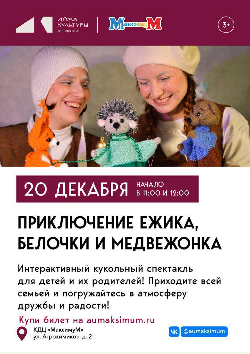 Друзья! Приглашаем вас на интерактивный кукольный спектакль, который состоится 20 декабря! Билеты можно приобрести по ссылке: https://aumaksimum.ru/product-category/tickets/