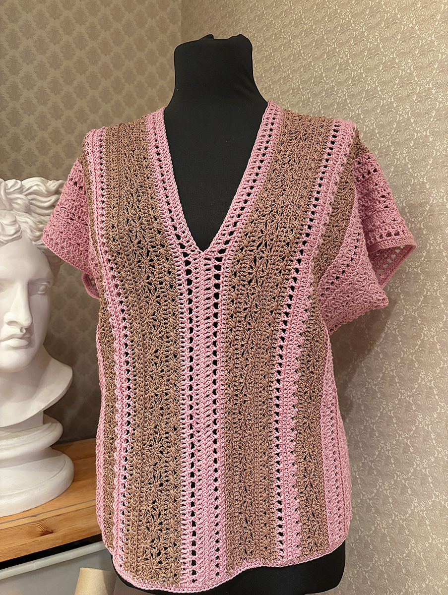 В этой статье я хочу поделиться с вами готовой работой и рассказать о процессах, которые сейчас находятся у меня на спицах и крючке. Начну с готового изделия. Это поперечный топ, связанный крючком. Проект совместного вязания проходил в Телеграм, вход туда открыт — добро пожаловать. Для этого топа я вдохновилась двумя фотографиями. Сейчас я вам их покажу. Первый топ был без застёжки, второй - на пуговицах. В своём совместном вязании я подробно рассказываю, как связать оба варианта. Вязание несложное, подойдёт даже тем, кто не любит слишком сложные конструкции. Я немного усовершенствовала эту модель. Обычно у таких топов на спинке есть так называемый треугольник выреза. Мне захотелось от него избавиться, поэтому я решила закрыть этот треугольник. Мы связали дополнительный элемент для топа, и, на мой взгляд, так он выглядит гораздо симпатичнее. Фотографию обязательно ставлю. Помимо этого, в процессе у меня сейчас несколько работ. Одна из самых больших - джемпер регланом свер