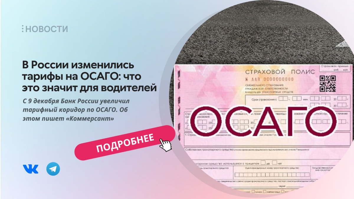 🔰В России 🇷🇺 изменились тарифы на ОСАГО: что это значит для водителей👇 🚗 Последнее расширение тарифного коридора было в 2022 году. С тех пор средняя выплата по ОСАГО выросла в 1,5 раза, а стоимость снизилась на 4%. После изменений от 9 декабря тарифы будут больше: 💥на 15% для легковых авто, автобусов и грузовиков; 💥на 40% для мотоциклов. Новые стандарты, по заявлению Банка России, дадут возможность страховщикам устанавливать более справедливые тарифы, учитывая риски каждого водителя. 💥 Если у автомобилиста много аварий, ему будет предложена страховка по повышенной стоимости. Но если он не попадал в ДТП вообще и ездит аккуратно, стоимость будет снижена. Так, страховые компании получат больше возможностей для формирования цен. А автомобилисты будут оформлять ОСАГО по более справедливой стоимости. ➿➿➿➿➿➿➿➿➿➿➿➿ 🔰Ответим на все ваши вопросы и расскажем много интересного❕ Следи за нашими соц. сетями: 💙VK ➡️ https://vk.com/belmtzcentr 💬TELEGRAM ➡️https://dzen.ru/id/62592127