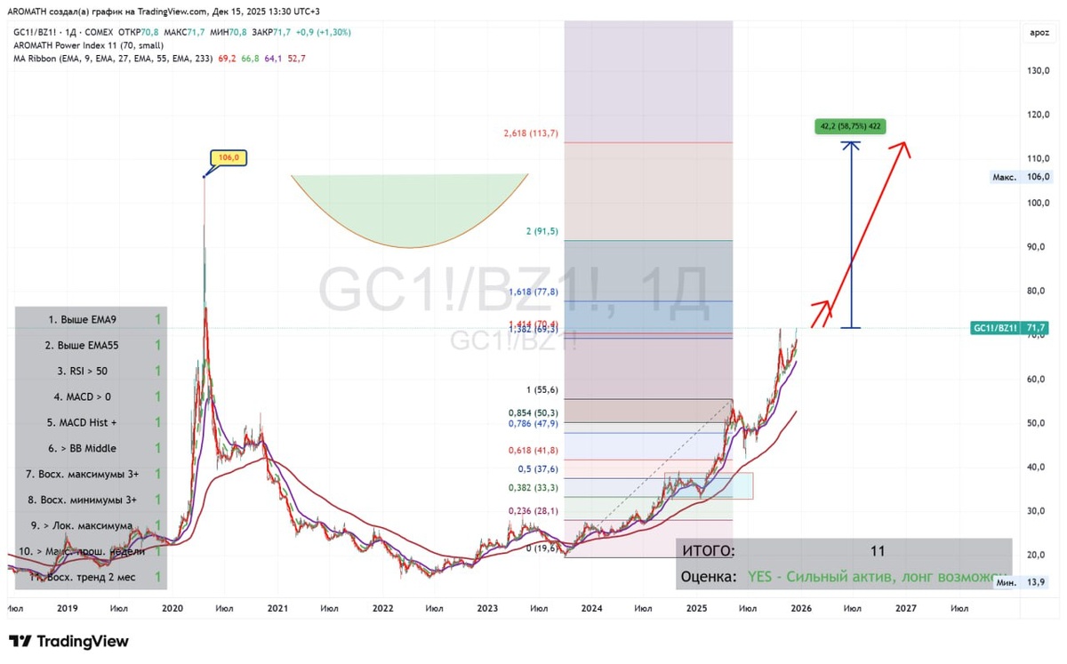 Рубрика #макроэкономика #макротренды в канале Aromath 💰 Золото по-прежнему намного сильнее нефти. Этого достаточно, чтобы делать деньги на бирже. Всё. Это и есть фокус 🔭