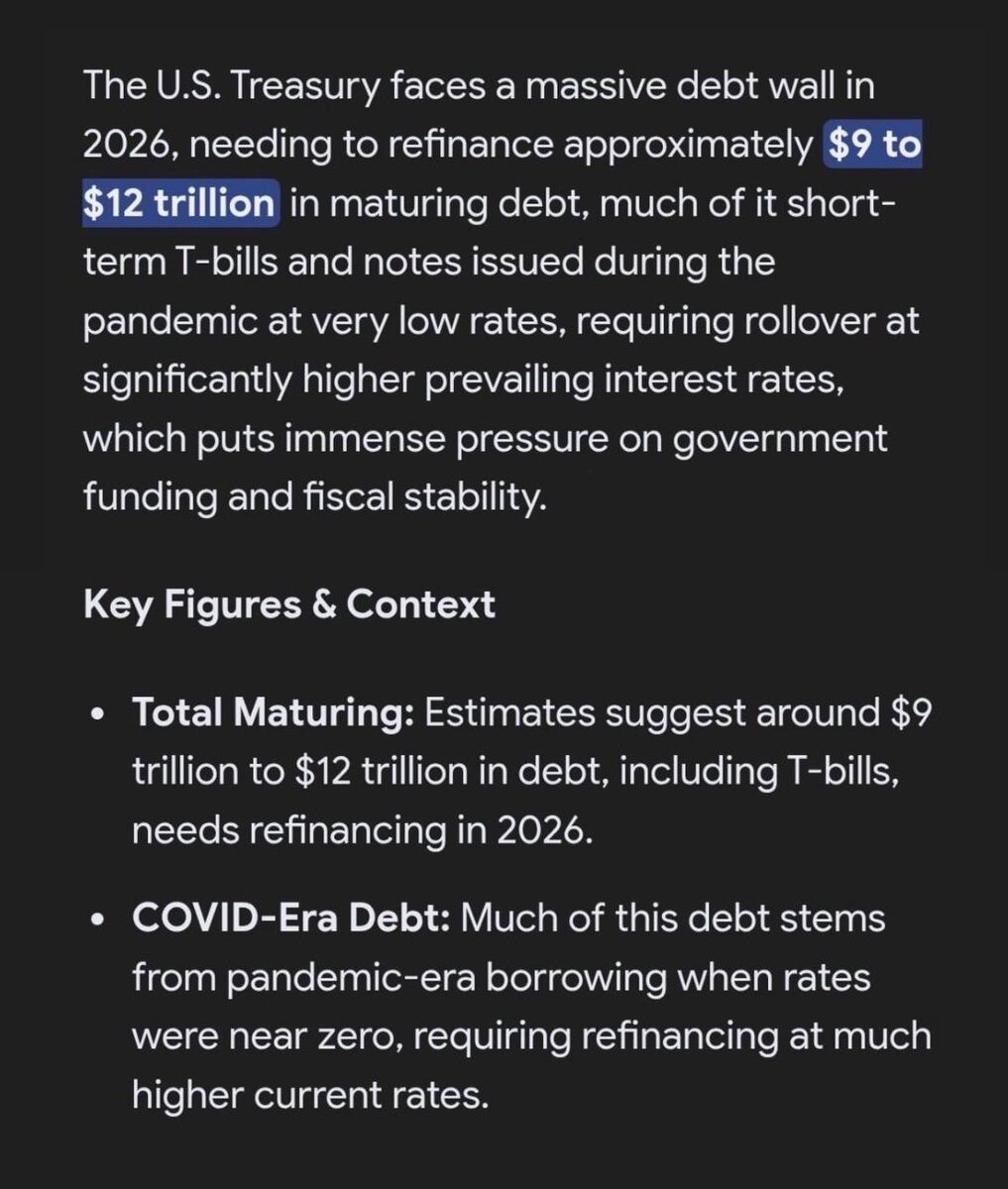 2026 — это не про будущее Иногда цифра выглядит как что-то далёкое. Типа «ну окей, через год-два разберутся». Но чем дольше на неё смотришь, тем меньше она про календарь — и тем больше про давление. В 2026 США нужно перекатать 9–12 трлн долларов долга. Не нового. Старого. Ковидного. Взятого почти бесплатно. Тогда деньги стоили ноль. Теперь — 4–5% и выше. И в этом месте у меня всегда возникает пауза. Потому что рынок часто обсуждает ставки, инфляцию, рецессию. Но редко обсуждает простую вещь: а за счёт чего это всё физически обслуживается. Когда ты перекладываешь триллионы долга: — ты либо платишь больше процентов — либо печатаешь — либо давишь систему ликвидностью — либо делаешь вид, что всё нормально, пока не становится заметно, что не нормально Других вариантов нет. Важно: это не история про дефолт США. Это история про выбор способа расплаты. И вот тут начинается самое интересное. Если ставки держать высокими — бюджет трещит, рынок облигаций начинает нервничать, фискальная