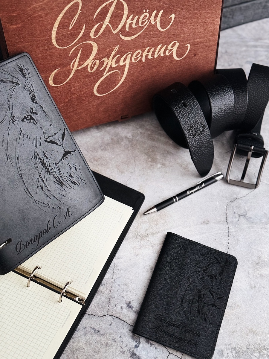 Именной набор для любимого -Блокнот со сменным блоком (экокожа) -Ручка -Обложка на паспорт кожаная -Ремень из натуральной кожи в деревянной коробочке 🔥 Гравировка уже ВКЛЮЧЕНА в стоимость 👌 -Страницы в клеточку, сменный блок -Ручка в цвет блокнота -Макет на выбор или по вашему дизайну ) -Любой текст и рисунок -На изготовление от 1 дня Отличный подарок на любой праздник🔥 Такой именной набор точно не оставит вашего мужчину равнодушным❤️ Доставка из Крыма в любой город РФ 👌