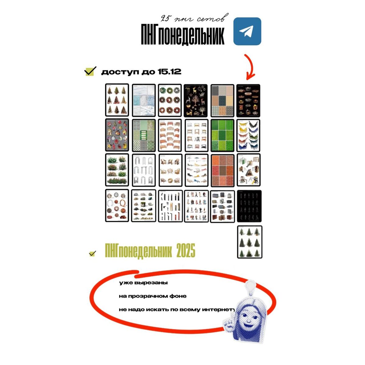 Сегодня последний ПНГпонедельник 2025 года ⏰ Напоминаю: сегодня последний день, когда можно скачать PNG-понедельники за 2025 год. Все 25 наборов растения, текстуры, мебель, люди всё закрываются сегодня. Если вы откладывали на потом, если хотели, но не успели, если думали «скачаю на выходных» вот это самое “потом” наступило 😅 Скачивайте сегодня, сохраняйте себе библиотеку и спокойно работайте дальше 🤗 Завтра доступ к ПНГпонедельникам 2025 будет закрыт. 👉🏻 все ПНГпонедельники А у нас новый ПНГпонедельник 👇🏻