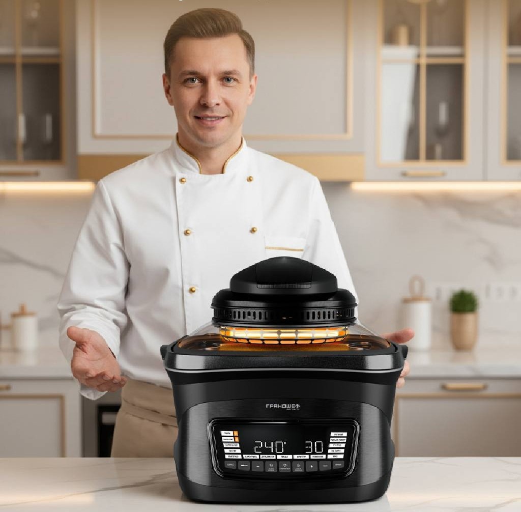 Дорогие друзья! В декабре мы отмечаем знаменательное событие — 1 год с момента появления нашего уникального аэрогриля Грандшеф! 🎉 За это время мы не только завоевали сердца тысяч пользователей, но и получили престижную премию «Бренд года»! В чем секрет успеха Грандшефа? Многофункциональность 14 автоматических программ, термощуп и ручной режим с настройкой температуры от от 1 до 250 °C. Это умная замена более 10 кухонных приборов: аэрогриля, духовки, гриля, пароварки, фритюрницы, су-вида, барбекю, дегидратора, тостера и др. Инновационная система нагрева Два ТЭНа общей мощностью 3100 Вт, нанокерамическое покрытие и конвекция 360°, позволяет приготовить ужин за 20–30 минут. Удобство Вместительная чаша объёмом 8 литров и двухъярусная система позволяют готовить для семьи из 4-х человек и несколько блюд одновременно, а умная система контроля отслеживает температуру и время и подсказывает когда нужно перевернуть. Качество и надежность Мы используем премиальные материалы и технологии, чтобы