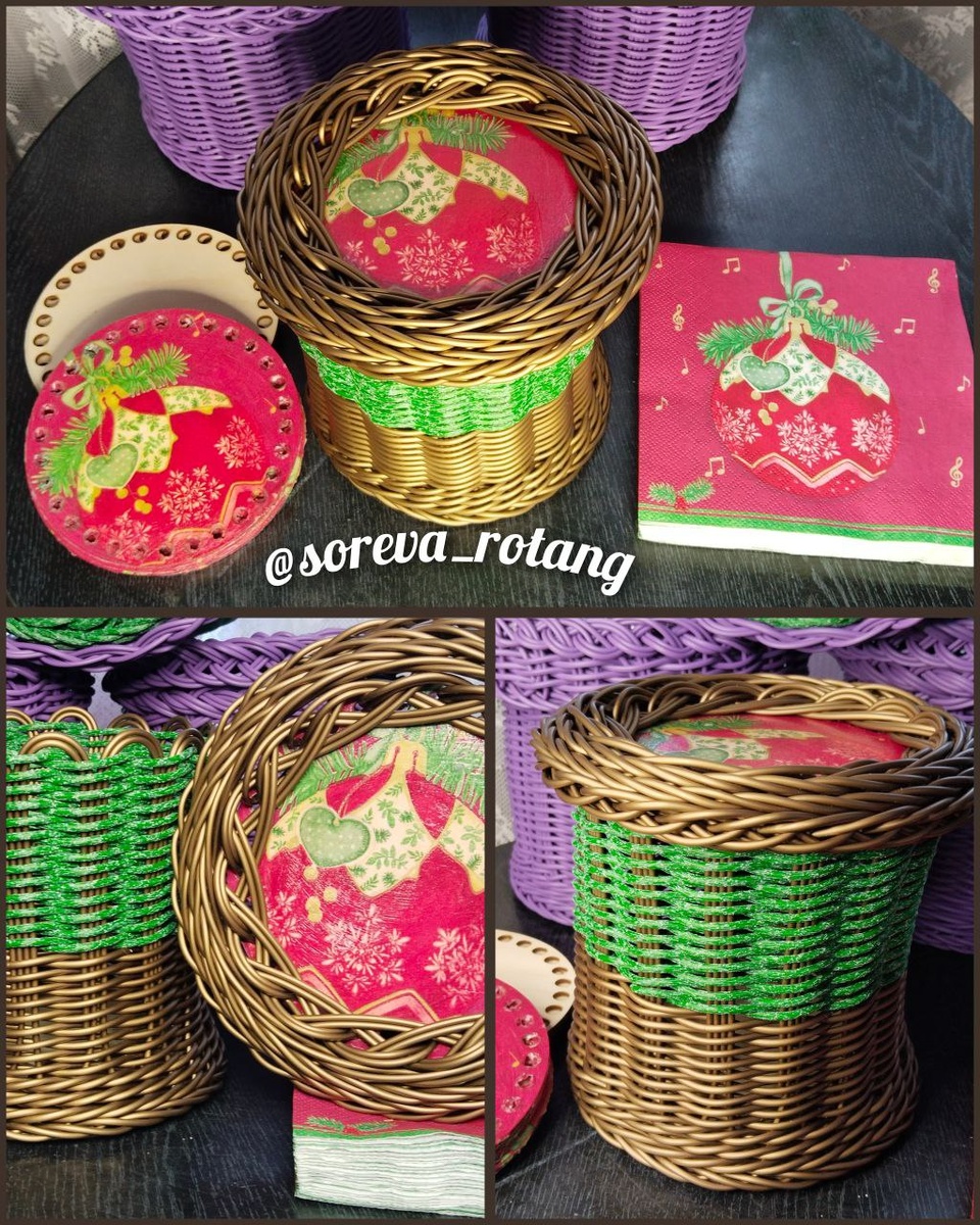 Знаете, я тут подумала, что подарки на Новый год совсем не обязательно должны быть строго тематическими. Мне хочется, чтобы мои подарочные корзинки радовали своих новых хозяек не только в праздники, но и весь год. Поэтому я решила сделать их в самых разных цветах, чтобы каждая смогла выбрать что-то по душе. Но и без новогодней тематики, конечно, не обойдется! Для таких случаев я даже сама украсила крышки корзинок в технике декупаж – получилось очень здорово! А вы уже начали готовить подарки?