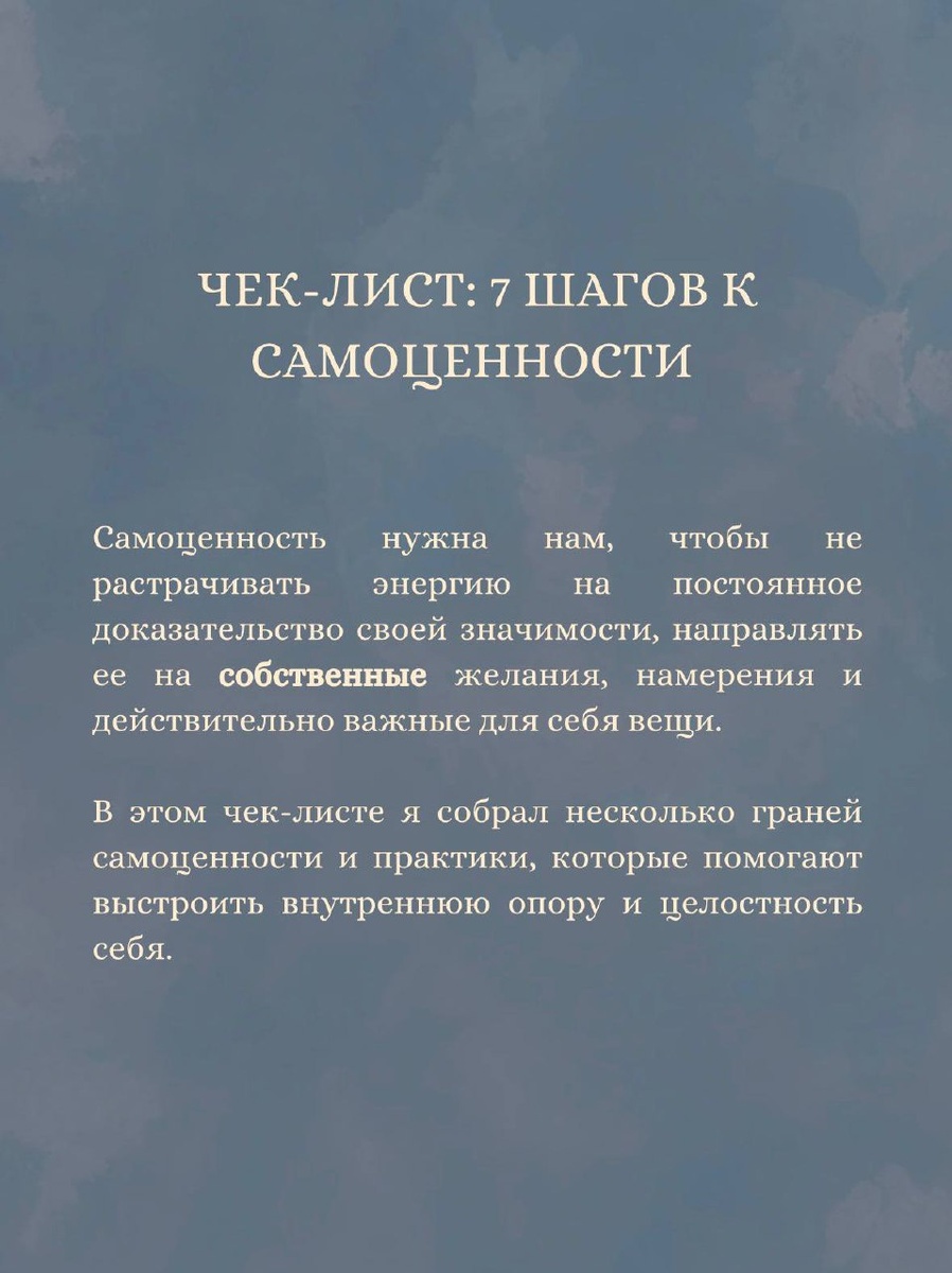 Самоценность — это то, что никто не может нам дать извне. С неё начинается восприятие себя в этом мире, формирование своей самооценки и уверенности в свои способности. 📌Когда у нас отсутствует самоценность, мы выстраиваем с собой потребительские отношения, в которых мы «хороши», только когда выполняем требования — свои и мира. Самоценность нужна нам, чтобы не растрачивать энергию на постоянное доказательство своей значимости, направлять ее на собственные желания, намерения и действительно важные для себя вещи. Это также про заботу о себе🫂: «Ничего страшного дружище, сегодня не получилось, но мы попробуем завтра снова, ведь я с тобой». И в конечном итоге, самоценность — это выбор жить своей жизнью и иметь смелость быть собой. В этом чек-листе я собрал несколько граней самоценности и практики, которые помогают выстроить внутреннюю опору и целостность себя.