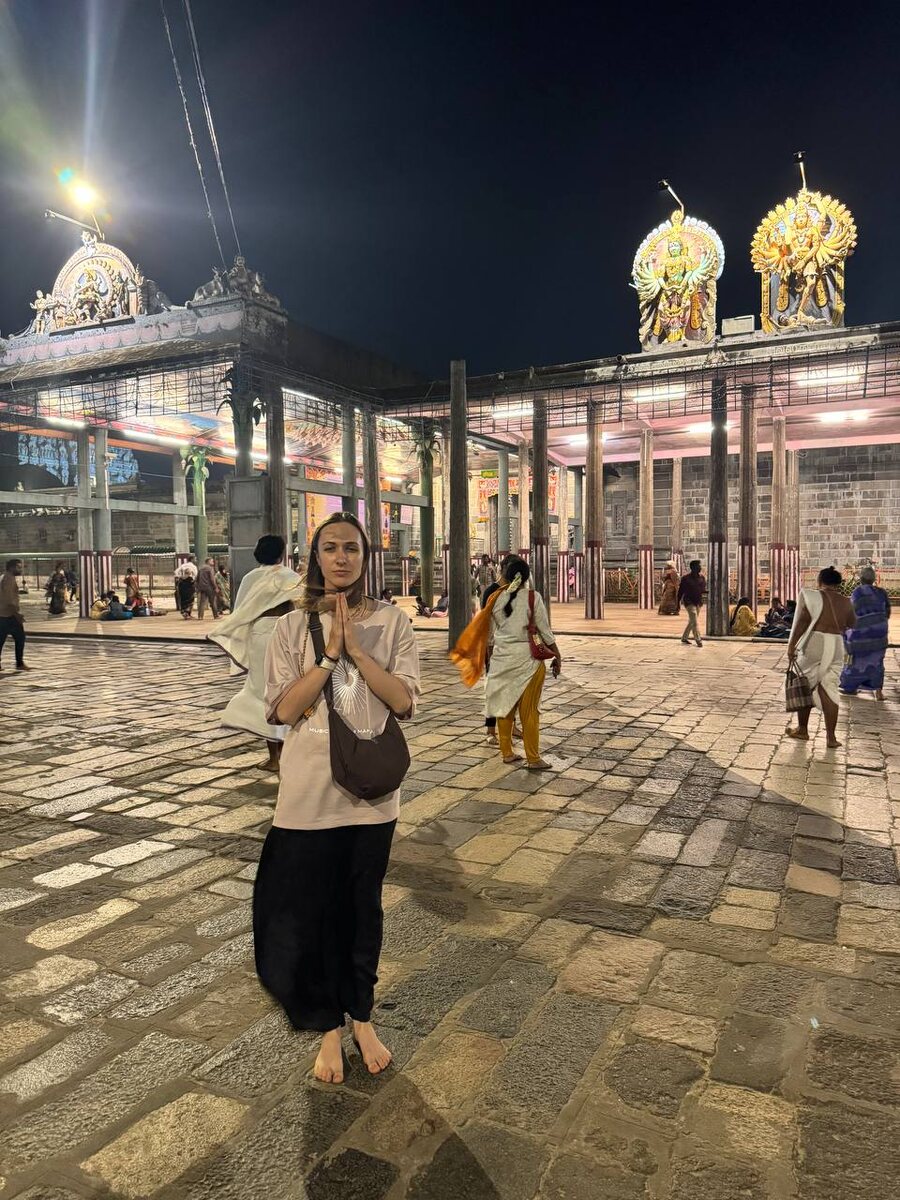 Чидамбарам — храм Шивы Натараджи Здесь Шива почитается как Натараджa, Владыка космического танца. Его танец — не образ, а язык Вселенной: рождение, сохранение, разрушение и освобождение происходят в одном ритме. Главная тайна храма — Чидамбарам Рахасьям. Рядом с образом Шивы — пустое пространство, скрытое занавесью. Это символ акаши, чистого пространства сознания. Напоминание о том, что Истина не всегда имеет форму — иногда она переживается как присутствие. Чидамбарам — один из Панча Бхута Стхалам, пяти храмов Шивы, связанных с первоэлементами. Здесь Шива — пространство, в котором возникает всё и в которое всё возвращается. Этот храм — не просто архитектура или ритуал. Это указание внутрь: тишина и движение — одно, танец и покой неразделимы, Шива — не где-то вовне, Он танцует в сердце того, кто смотрит. 🕉️ * Это мое второе посещение данного храма. Сегодня в вечернем свете он прекрасен.