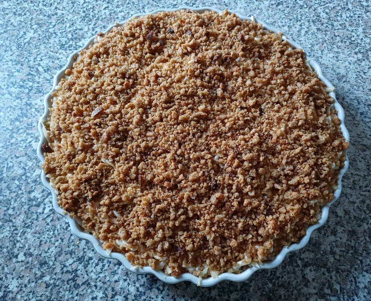 2 очищенные вареные картофелины,150гр. сыра(твёрдого),1 упаковка(200гр.) крабовых палочек,1 луковица,1 яблоко.Всё натереть на крупной тёрке,уложить слоями,в той последовательности,как написаны ингредиенты,каждый слой промазывать майонезом.Перед подачей на стол посыпать растолчёнными солеными сухариками,например кириешками. Приятного аппетита!
