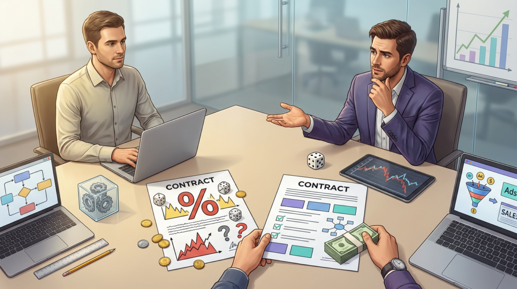 Чтобы честно работать «за процент», тебе нужны данные, право влияния на воронку, маркетинг, продажи. В реальности: «сделай автоматизацию, а дальше мы сами». - Высокий риск «работы в ноль» или «в минус».