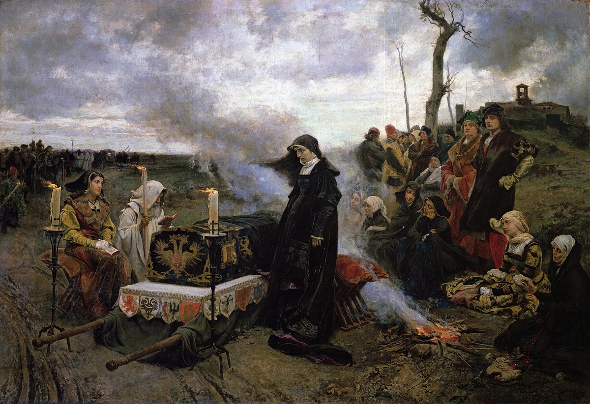 … Кортеж безутешной вдовы плелся по заснеженному полю. Гроб с телом короля покачивался в повозке; Хуана шла следом, от катафалка - ни на шаг. 4 месяца она в компании фрейлин, слуг, священников и солдат мела подолом дороги Кастилии; ждала, когда приедет ее отец Фердинанд Арагонский и позволит похоронить зятя Филиппа Габсбурга в Гранаде, как тот завещал. Отец медлил. Когда Хуана открыла гроб с забальзамированными останками (хотела убедиться, что ее красавец-супруг никуда не делся), члены процессии пришли в ужас. Потом вдова проделывала это еще пару раз; она обнимала и целовала холодный труп. В свите пополз слух о ее безумии.