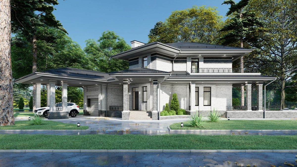 Проект двухэтажного жилого дом площадью 200 кв.м Уникальное расположение на угловом участке нестандартной формы определило его динамичный и запоминающийся силуэт. Несмотря на компактный метраж, дом производит впечатление величественного и просторного, благодаря широким свесам кровли и элегантным навесам, которые создают игру света и тени, визуально расширяя пространство. Наружная отделка, выполнена из кирпича ручной формовки благородных серых оттенков, придает строению изысканность и тактильность. Декоративные молдинги из фибробетона и ажурные кованые ограждения добавляют облику дома особый шарм и подчеркивают внимание к деталям. Внутри дом спроектирован для комфортной жизни небольшой семьи, предлагая четыре жилые комнаты, где каждый найдет свой уголок.