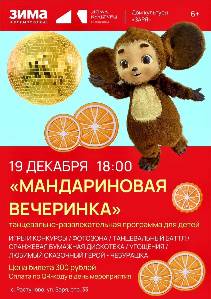 ✨ 🍊 МАНДАРИНОВАЯ ВЕЧЕРИНКА 🪩 Сельский Дом культуры «Заря» приглашает мальчишек и девчонок на танцевально-развлекательную программу «МАНДАРИНОВАЯ ВЕЧЕРИНКА» В программе: 🍊игры и конкурсы 🍊 танцевальный баттл 🍊 тематическая фотозона 🍊 сладкие угощения 🍊 оранжевая бумажная дискотека 🍊 любимый сказочный герой - Чебурашка 🔸 Оранжевый цвет в одежде приветствуется! 🚫 Возраст: 6+ 📆 19.12.2025🕒18:00 🏢 Сельский дом культуры (СДК) «Заря» 📍 г.о.Домодедово, с.Растуново, ул.Заря, д.33 💰 Цена: 300 ₽ ✅ Мероприятия Домодедово https://dzen.ru/id/66f10385cc4c5a16f7b5fb02 http://vk.com/domodedovo_events http://dzen.ru/domodedovo_events