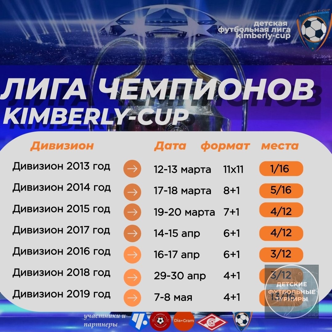 ⚽ «Лига Чемпионов» Kimberly⚽ 😎Друзья, рады поделиться с Вами новыми датами турнира "Лига Чемпионов Kimberly на 2026 год ! 🏆Турнир "Лига Чемпионов" ⚡12-13 марта - 2013 года(11х11) ⚡17-18 марта - 2014 год(8+1) ⚡19-20 марта - 2015 год(7+1) ⚡14-15 апреля - 2017 год(6+1) ⚡16-17 апреля - 2016 год(6+1) ⚡29-30 апреля - 2018 год(4+1) ⚡7-8 мая - 2019 год(4+1) 🤟Заявить команду на участие в "Турниры Kimberly" по телефону +7 (916)969-39-57 Павел (WhatsApp) или оставить заявку на – https://kimberly-cup.ru/champions-league --- #ФутбольныйТурнирМарт2026 #ФутбольныйТурнирАпрель2026 #ФутбольныйТурнирМай2026 #ФутбольныйТурнирМосква2026 #ФутбольныйТурнирМосква2013гр #ФутбольныйТурнирМосква2014гр #ФутбольныйТурнирМосква2015гр #ФутбольныйТурнирМосква2016гр #ФутбольныйТурнирМосква2017гр #ФутбольныйТурнирМосква2018гр #ФутбольныйТурнирМосква2019гр Источник: https://vk.com/wall-170500093_1249