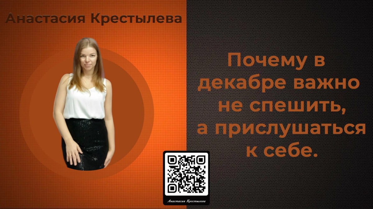 Почему в декабре важно не спешить, а прислушаться к себе Анастасия Крестылёва Декабрь будто кричит: «Быстрее! Успей! Закрой! Дожми!» И мы подхватываем этот ритм — бежим, планируем, сравниваем себя с чужими итогами… А внутри всё чаще звучит другое: «Мне тяжело. Я устал(а). Я не успеваю за этим темпом». И это не слабость. Это сигнал. Декабрь — особенный месяц. Психика естественно замедляется, потому что подходит к завершению цикла. Нам важно не ускоряться, а оглянуться, не требовать от себя подвигов, а услышать: что со мной сейчас? Если в декабре вы чувствуете: — больше усталости, чем обычно; — раздражение без явной причины; — желание побыть в тишине; — снижение мотивации и энергии — с вами всё в порядке. Это не «лень» и не «провал». Это потребность в паузе. Мы часто боимся остановиться, потому что кажется: если замедлюсь — всё развалится. Но на практике происходит обратное. Когда мы прислушиваемся к себе, появляется ясность: что действительно важно, а что можно отпустить без чувст