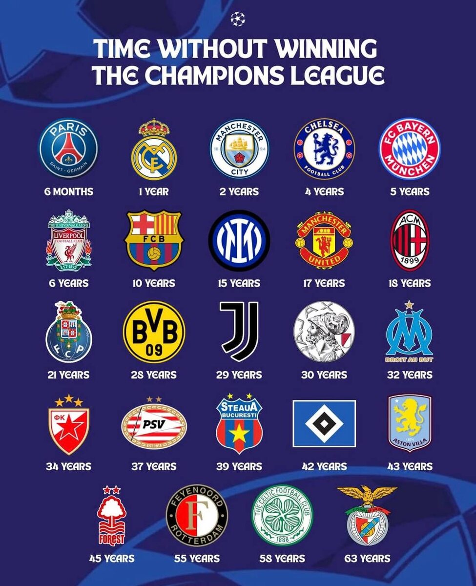 🇪🇺 Сколько прошло времени с последнего выигранного трофея ЛЧ: Кто удивляет в этом списке, кого может не знали что они побеждали в ЛЧ (до 1992 Кубок европейских чемпионов) ❓ ➡️ Подписаться на ФутХайп