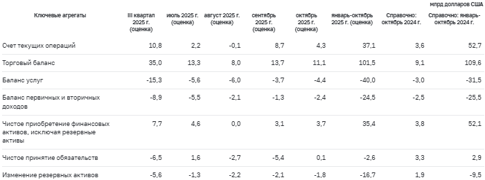 Динамика показателя к предшествующему периоду обусловлена сокращением профицита торгового баланса и увеличением дефицита прочих компонентов текущего счета, сообщает Банк России. Источник: Банк России По предварительным оценкам, профицит счета текущих операций РФ в октябре 2025 года составил $4,3 млрд, сообщил вечером понедельника Банк России. Это меньше, чем $8,7 млрд месяцем ранее, но больше, чем $3,6 млрд годом ранее. «Динамика показателя к предшествующему периоду обусловлена сокращением профицита торгового баланса и увеличением дефицита прочих компонентов текущего счета», — отмечает регулятор. — «В январе — октябре 2025 года профицит счета текущих операций уменьшился до 37,1 млрд долларов США с 52,7 млрд долларов США в соответствующем периоде 2024 года в равной мере за счет снижения профицита торгового баланса и увеличения дефицита баланса услуг при устойчивом дефиците первичных и вторичных доходов». Также Банк России отметил следующие события, имевшие место в октябре: MarketSnapsho