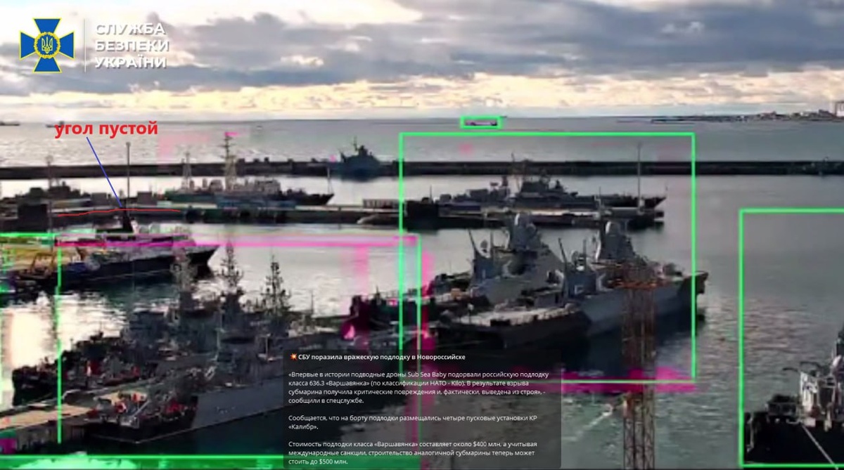 хорошо виден пустой угол с темными следами воды на бетоне. Реальные корабли в зеленых прямоугольниках. Взято с вражеского видео.
