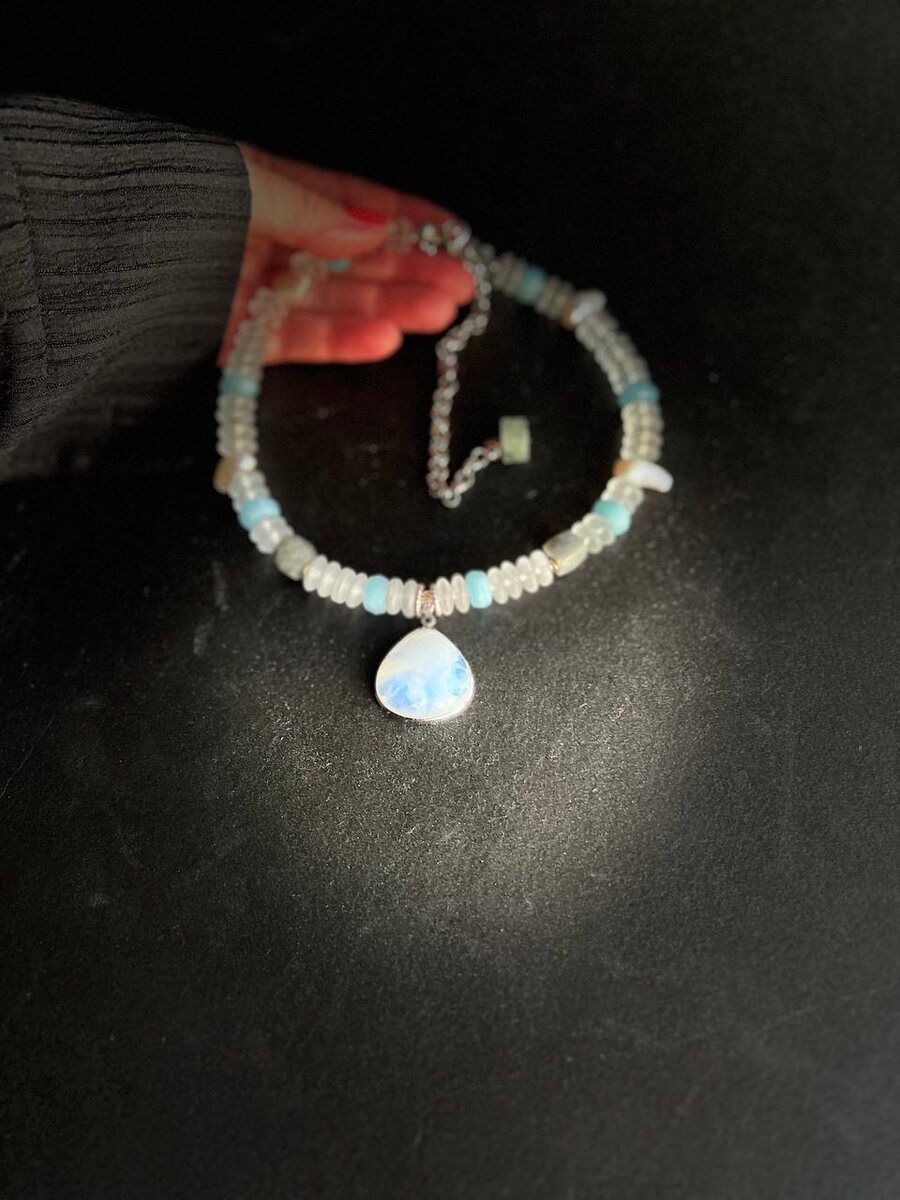 Аквамарины, жемчуг, хрусталь. И редкий лунный камень - треугольный кулон с ярким сиянием. Лёгкий чокер, как будто из волшебства сказки "Снежная королева" Какое там слово нужно было собрать из льдинок? 💎🎁 Подарочная упаковка, отправка по России бесплатно 💫💫 Создаю украшения для радости из жемчуга и красивых камней, чтобы женщины становились счастливее @ho_evgeniya