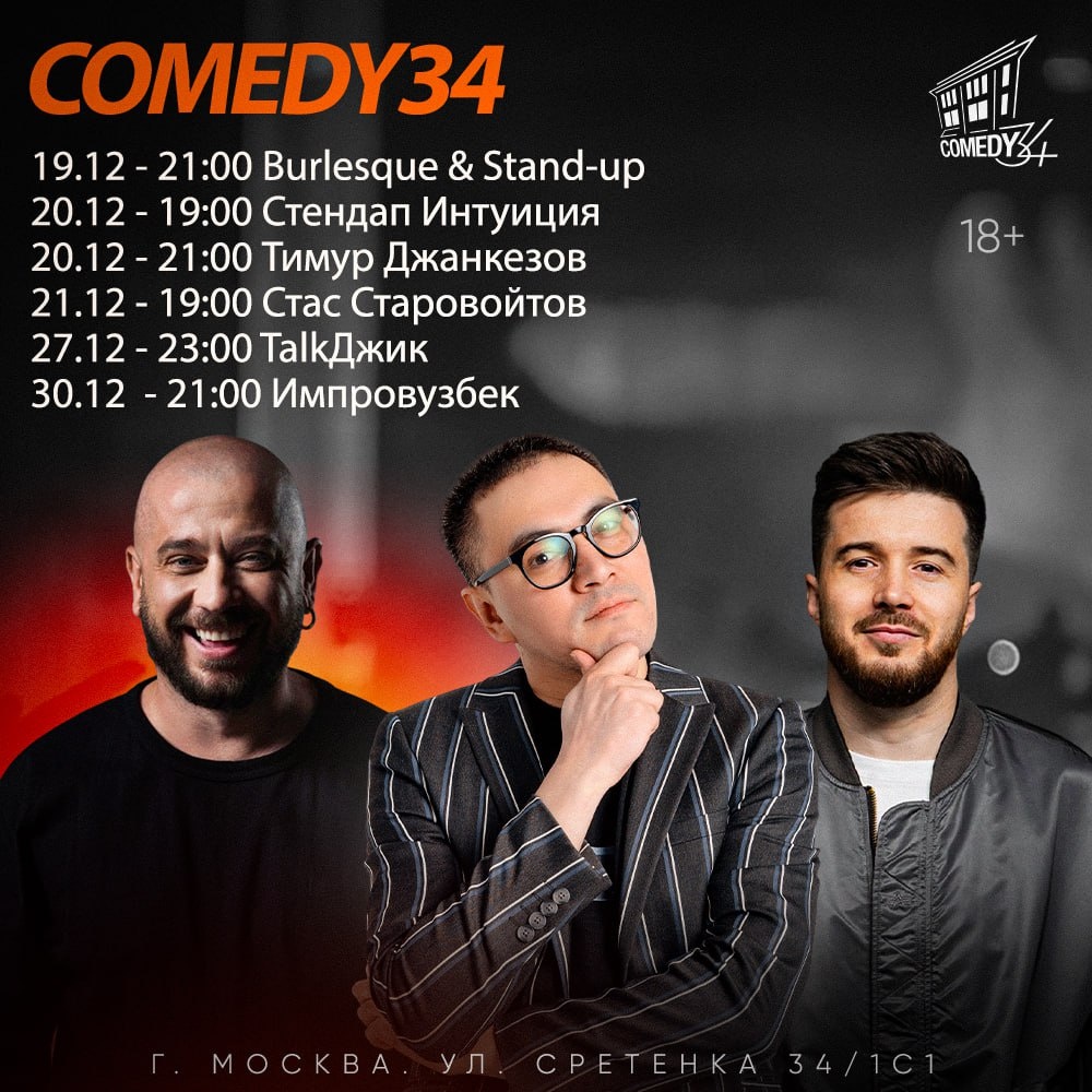 Комики с ТНТ, наше флагманское импровизационное шоу "ИмпровУзбек" и многое другое Собрали для вас самые интересные шоу второй половины декабря 19.12|| 21:00 Burlesque & Stand-up 20.12||19:00 Стендап Интуиция 20.12||21:00 Тимур Джанкезов сольный концерт 21.12||19:00 Стас Старовойтов сольный концерт 27.12|| 23:00 TalkДжик 30.12|| 21:00 ИмпровУзбек