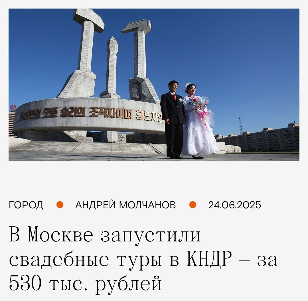 Свадебные туры в КНДР Как при помощи вирусной новости запустить целое направление? Рассказываю как этим летом одним объявлением я смогла помочь еще больше укрепить взаимоотношения двух стран. Продолжение и обсуждение на моем частном канале про маркетинг